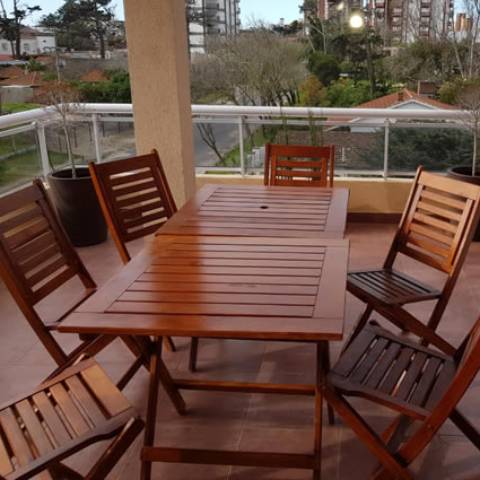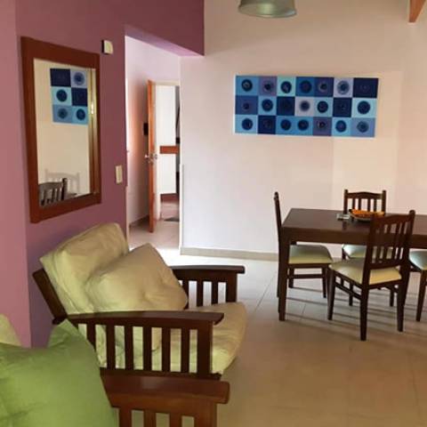 Dormitorio con sommier matrimonial y cómodo placard. Contamos con un amplio y luminoso living comedor, equipado con un futón de dos plazas y un futón de una plaza. TV y cocina totalmente equipada para que usted se sienta como en casa. Vajilla de porcelana, horno microondas, heladera con freezer, caldera y cocina.